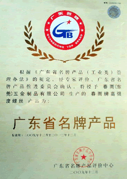 春雨(東莞)五金制品有限公司成為去年廣東省唯一獲得緊固件品牌的企業(yè),公司生產(chǎn)的"春雨牌高強(qiáng)度螺絲"品牌被廣東省名牌產(chǎn)品推進(jìn)委員會(huì)確定為廣東省名牌產(chǎn)品。
